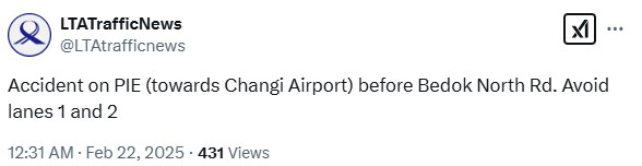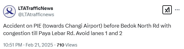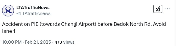 The Land Transport Authority’s (LTA’s) Traffic News account on X first posted about the accident at 10pm on Friday (21 Feb), advising motorists to avoid lane 1 before the Bedok North Road exit.