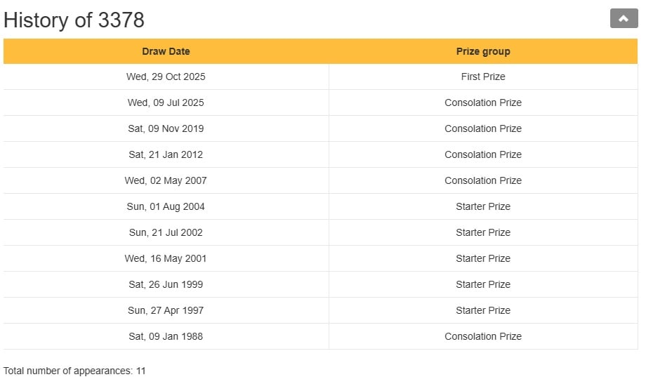 According to the Singapore Pools website, the number “3378” has won 11 times previously, with the first occurrence in 1988.