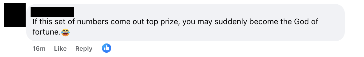 Comments came flooding in on Minister Shanmugam’s Facebook post, joking that he would be the God of Fortune if the number ended up being one of the top prizes.