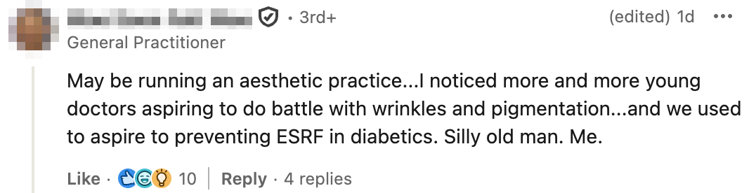 Another commenter suggested the clinic might be an aesthetic practice, observing that more young doctors now pursue cosmetic work over traditional chronic care.