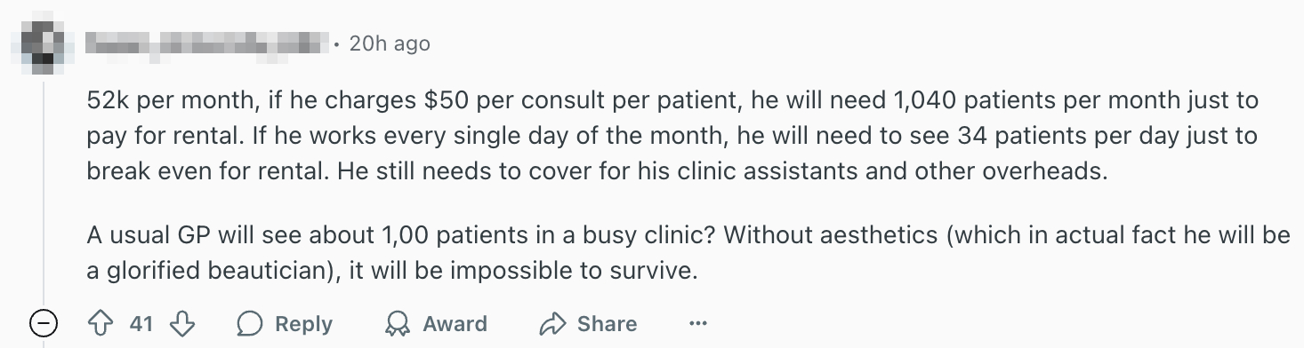 One commenter even did the maths, estimating that if the clinic charges S$50 per consultation, it would need to see at least 1,040 patients a month just to cover rent — excluding staff salaries and other overheads.
