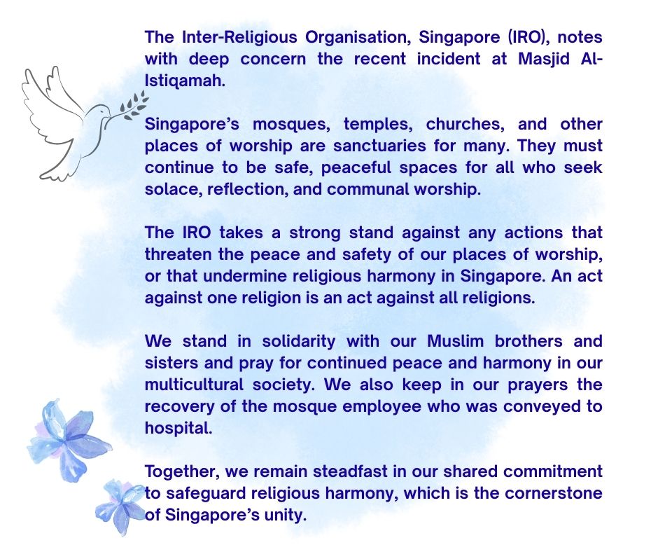 It wrote, “IRO takes a strong stand against any actions that threaten the peace and safety of our places of worship or that undermine religious harmony in Singapore.”