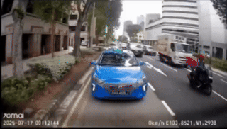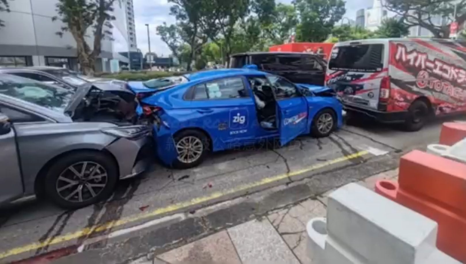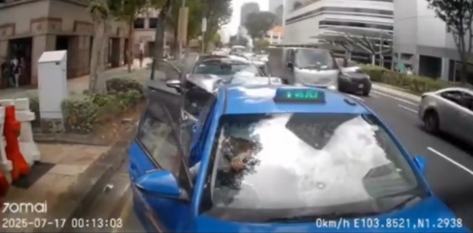 Footage of the crash posted by Singapore roads accident.com on Facebook showed a silver car colliding into the back of the stationary ComDelGro taxi.