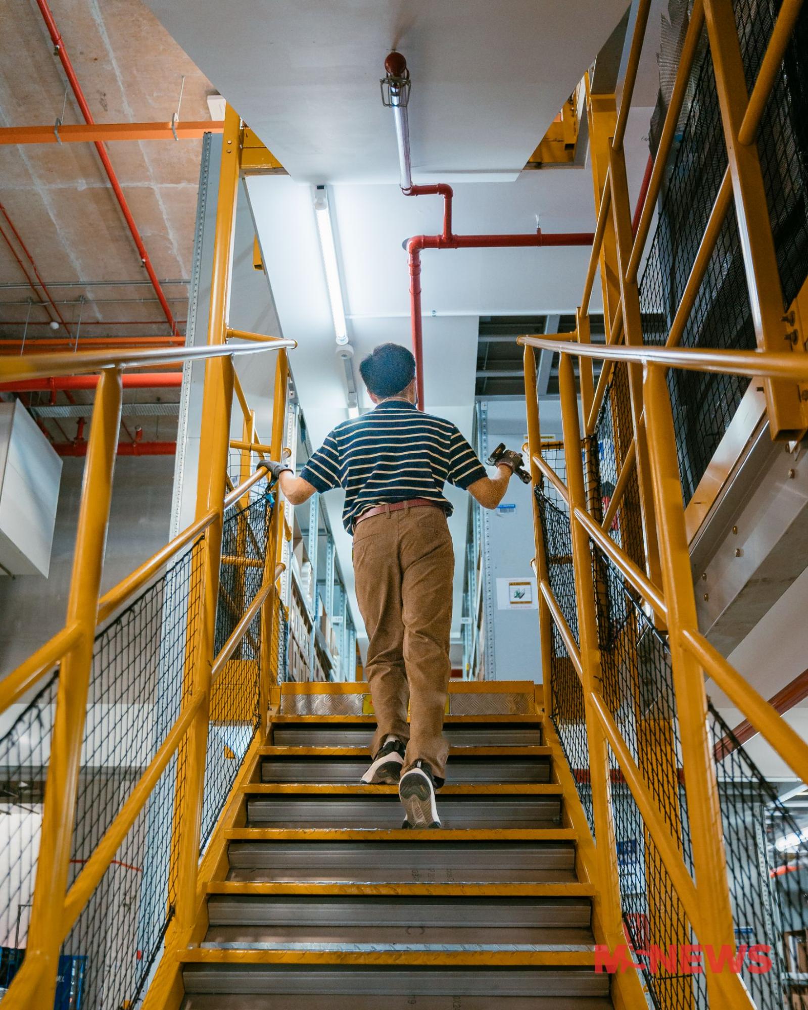 Neatness matters to him — if a box is jutting out of a shelf, he’ll push it back in without a word. But more importantly, it’s about staying safe in a space where trolleys roll past constantly.