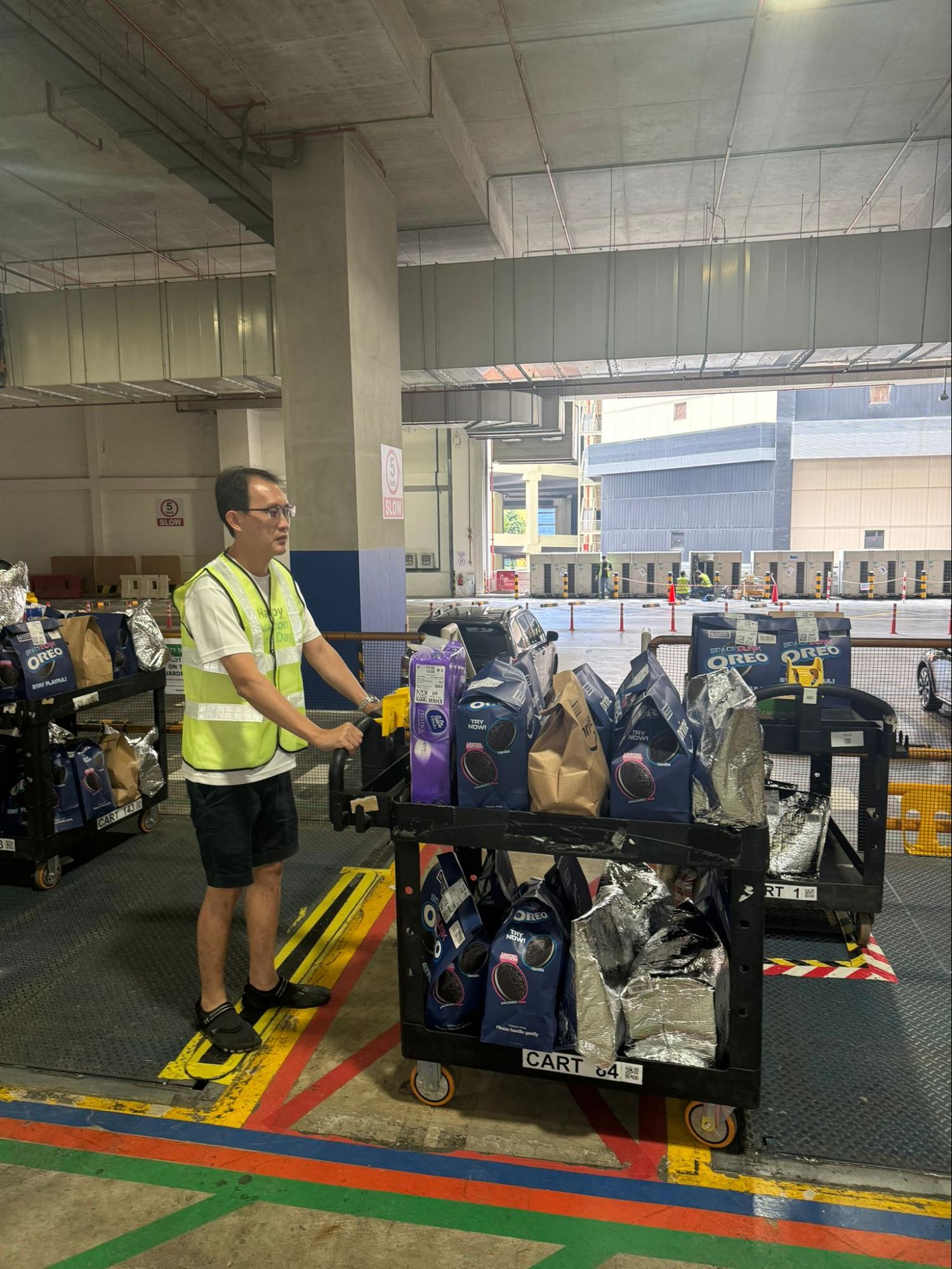 He moves swiftly but assuredly, steering his trolley — stacked with bright yellow tote boxes — through the aisles with the ease of someone who knows the place like the back of his hand. Once the tote is full, he wheels them off to the next station for sorting and delivery before starting all over again.