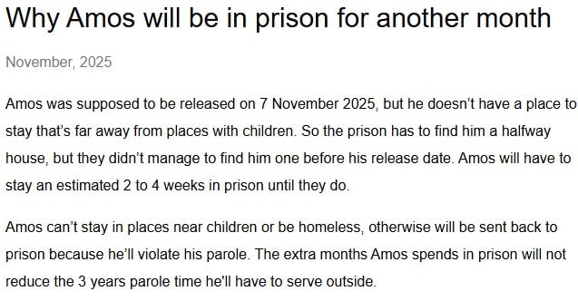 But they did not manage to do so before 7 Nov, so he had to stay longer in prison till they found him a place to stay.