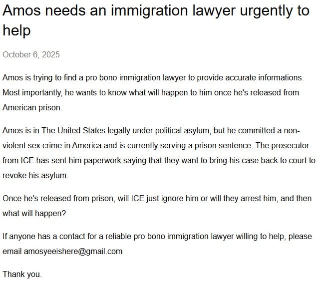 He needed recommendations for an immigration lawyer to help him on a pro bono basis (without charge), as he is unsure what would happen after his release.