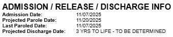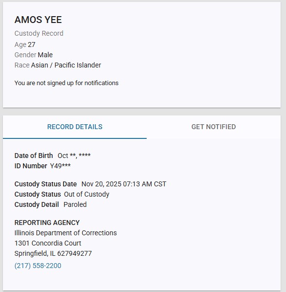 Latest information from the Illinois Department of Corrections states that he was last paroled on 7 Nov, but readmitted to Danville Correctional Center on the same day, then finally paroled again on 20 Nov.