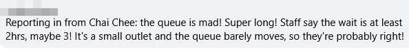 A Facebook user reported the Chai Chee outlet had a “super long” queue at 5.55pm that stretched to at least two hours.