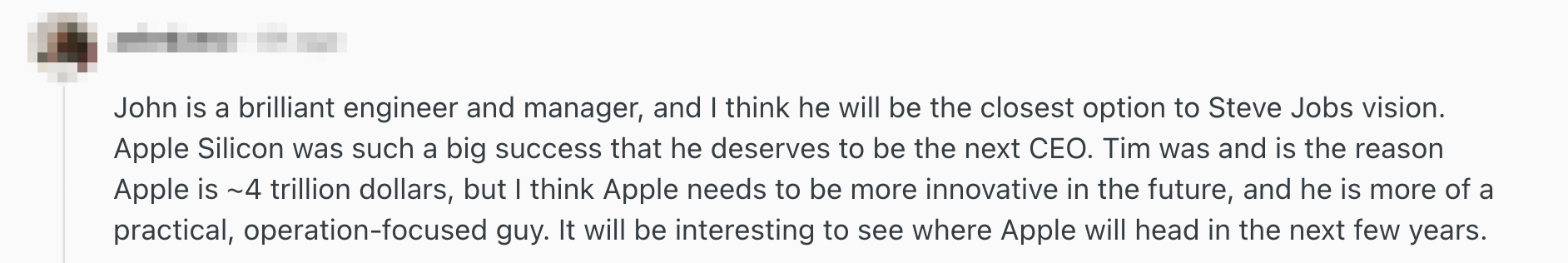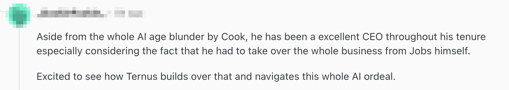 And while they gave credit to the outgoing CEO for his business smarts, the Redditor noted that Apple needs more innovation in the future, which Mr Ternus may be more poised to oversee.