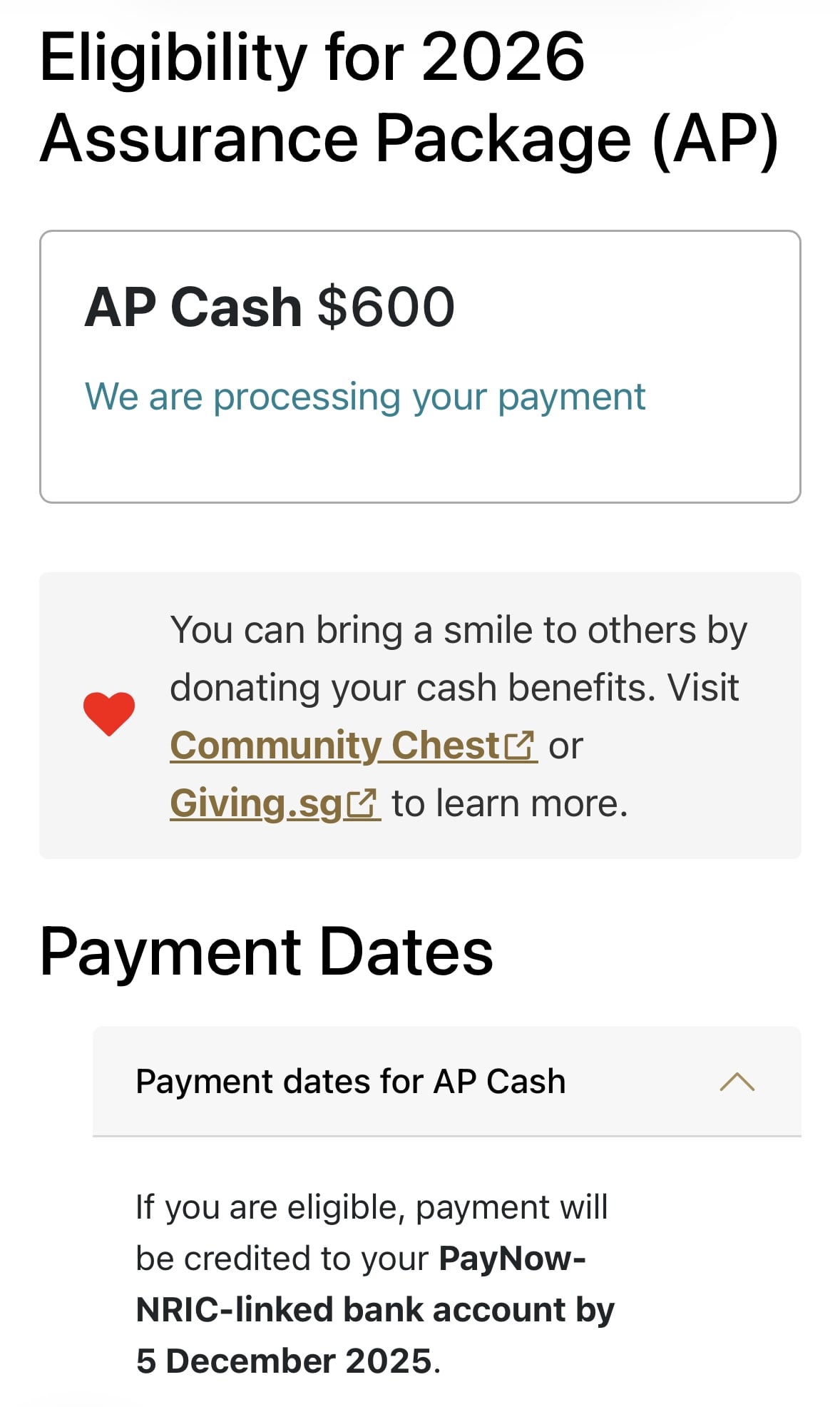 From 5 Dec, eligible Singaporeans will receive up to S$600 in cash payouts under the Government’s enhanced Assurance Package (AP).