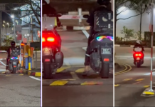 3 weeks ago 2 motorcyclists with M’sian licence plates seen exiting gantry of Marina Bay carpark simultaneously