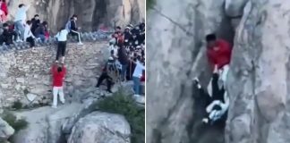 7 months ago 2 tourists almost fall off mountain in China after climbing over barrier to avoid crowds
