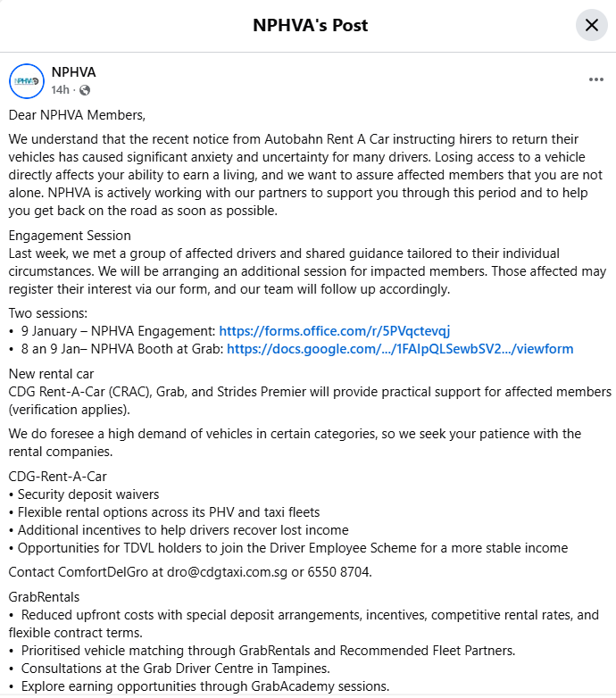 On Tuesday (6 Jan), the National Private Hire Vehicles Association (NPHVA) said it had met affected drivers to address rental disputes and vehicle repossessions linked to financial difficulties at rental companies.