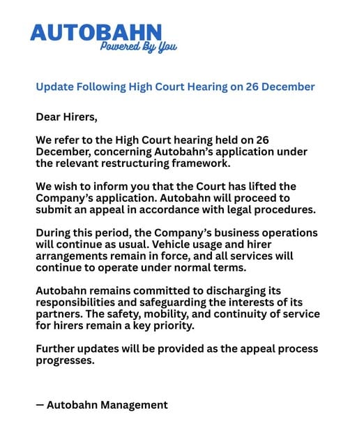 This was despite Autobahn previously assuring hirers on a Facebook post on 26 Dec 2025 that operations would continue as usual even after its court application for protection was dismissed.