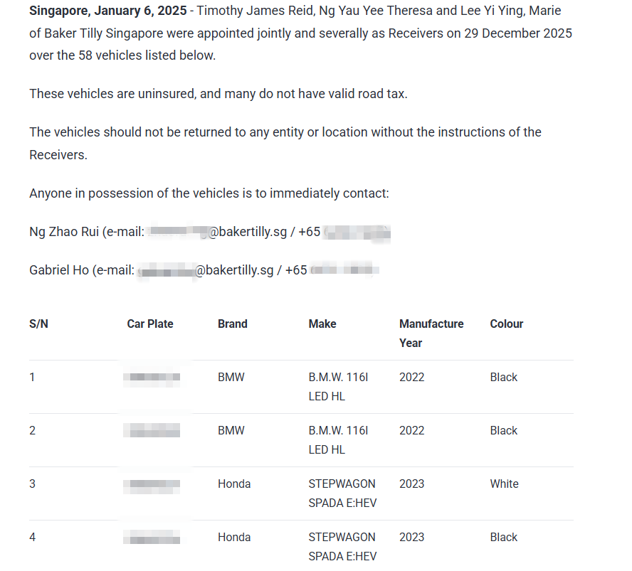 “These vehicles are uninsured, and many do not have valid road tax,” Baker Tilly warned, adding that the vehicles should not be returned to any party without the receiver’s instructions.