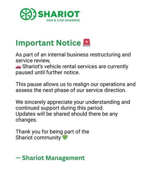 The latest development comes after Shariot, Autobahn’s car-sharing arm, announced on 31 Dec 2025 that it was suspending its vehicle rental services until further notice.