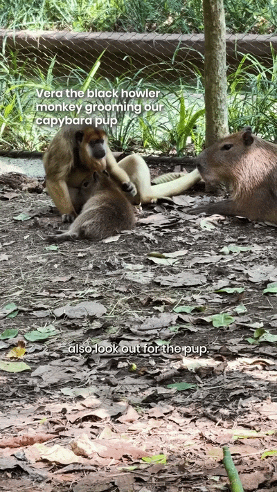 The capybaras are housed in a mixed-species exhibit, where other animals, including primates, share the space.
