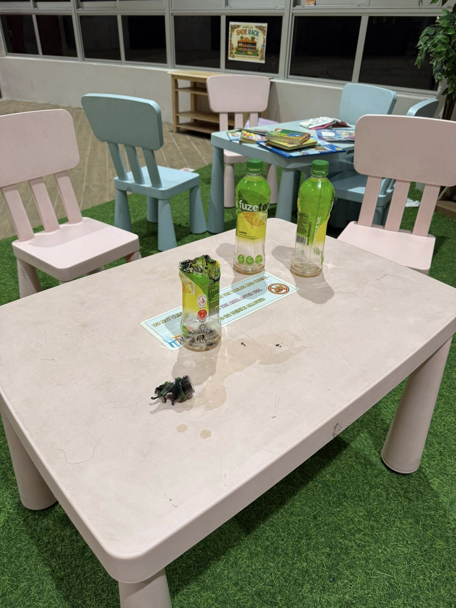 A photo that the MP shared showed three empty plastic drink bottles left on a discoloured table in the library.