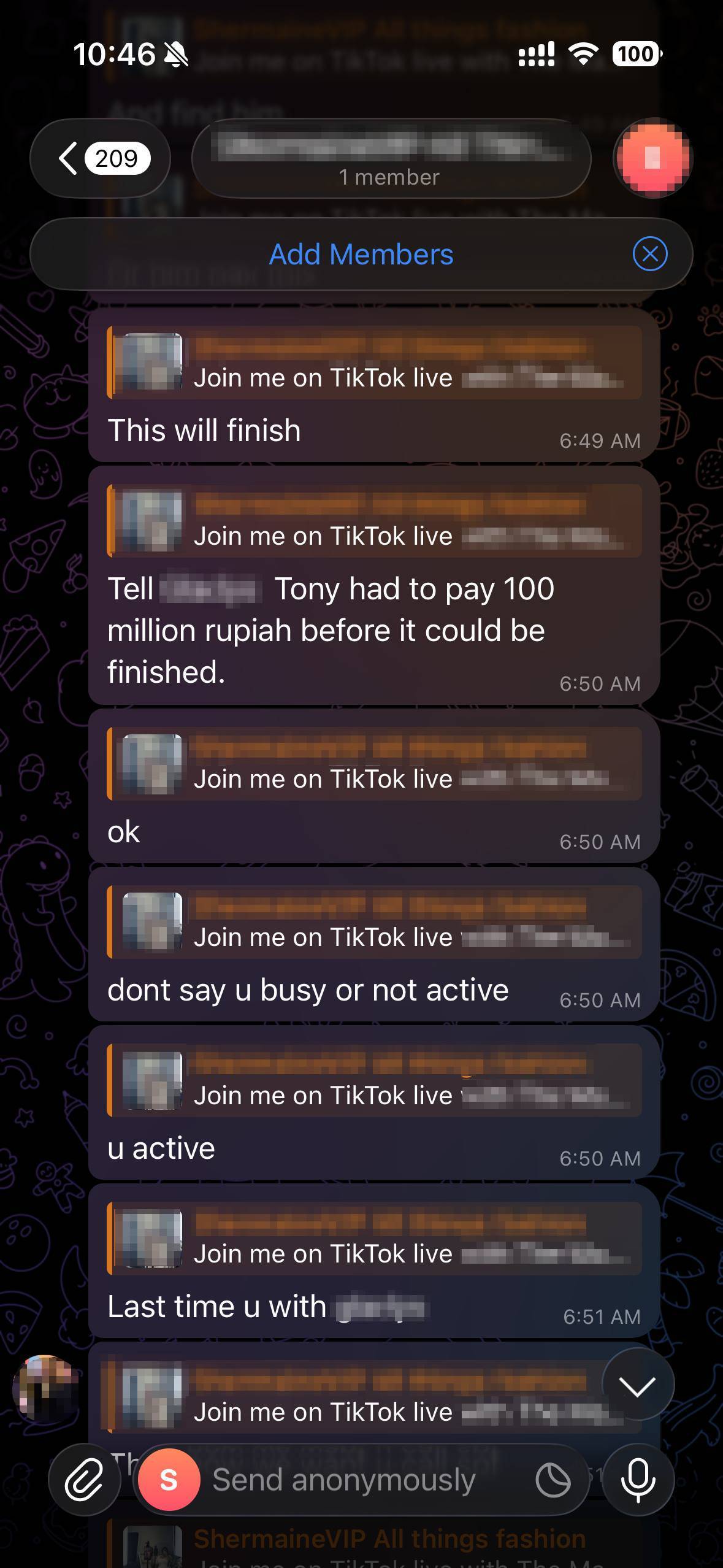 After being blocked, A allegedly escalated her actions. She spammed the influencer’s public Telegram channel and posted comments on TikTok and livestreams using multiple accounts.