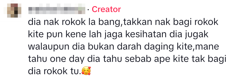 Translation: She wants a cigarette, bro. We can’t just give her cigarettes, we have to care for her health, too, even though she’s not our blood. Who knows, one day she might understand why we didn’t give her that cigarette.