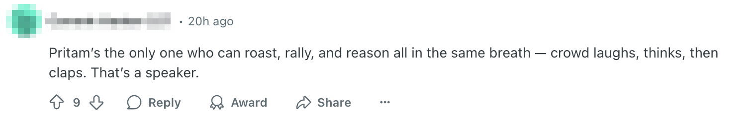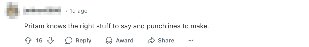 In a similar vein, another Redditor remarked: “Pritam knows the right stuff to say and (the) punchlines to make.”
