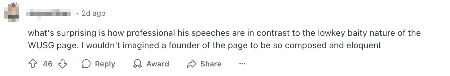 Mr Ariffin’s speeches were unexpectedly “professional”, according to one user, especially considering the “baity nature” of the Wake Up Singapore page, which he founded.