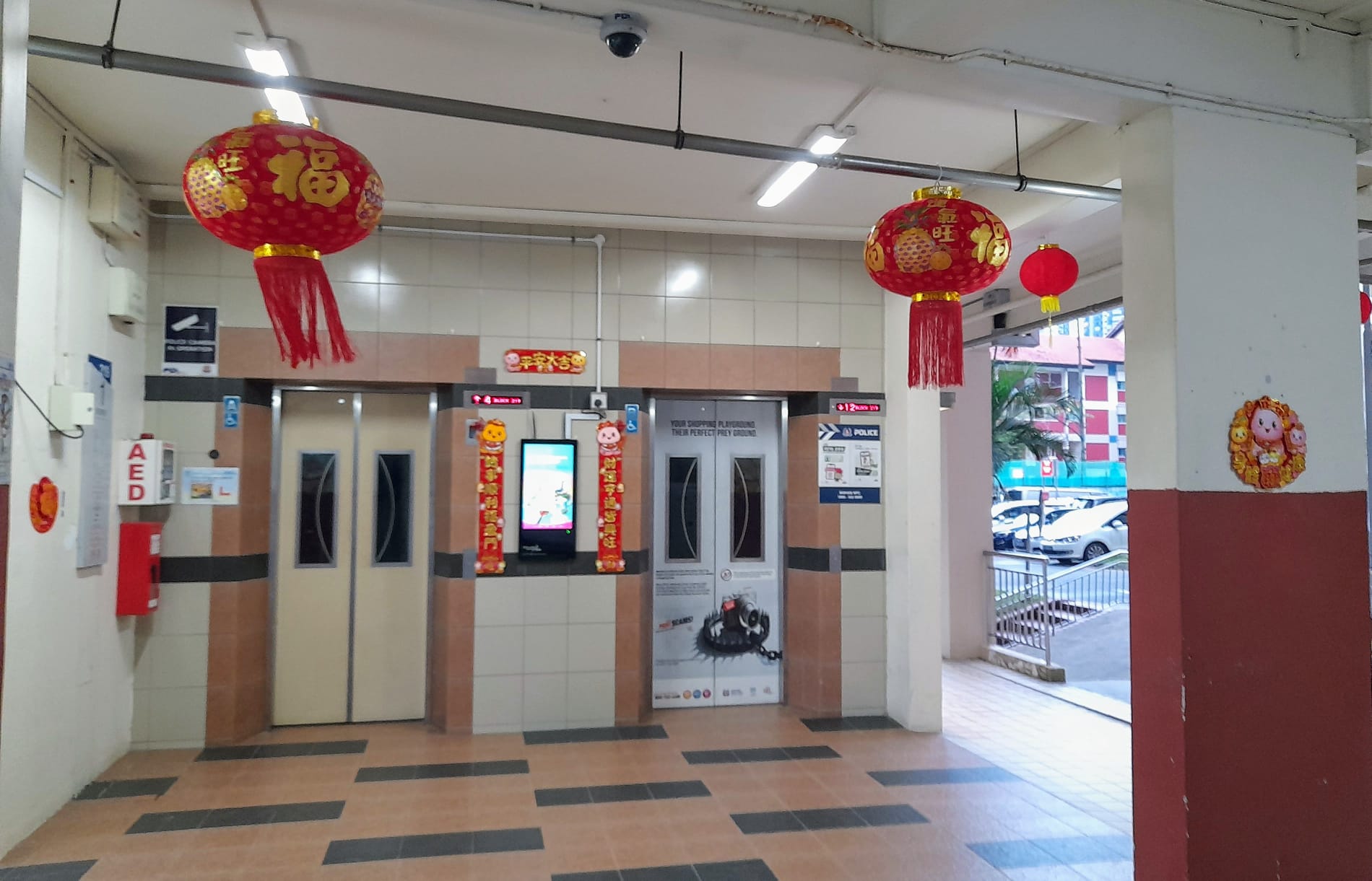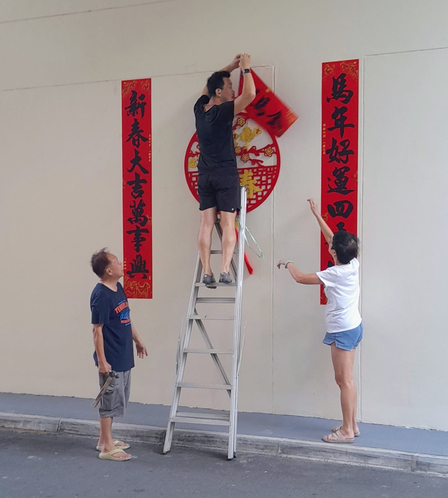 Residents put up 26 lanterns around the void deck and lift lobby, alongside red chunlian couplets and floral decorations.