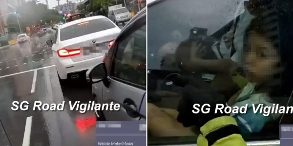 BMW blocks straight ahead lane in AMK, angry motorcyclist knocks on their window