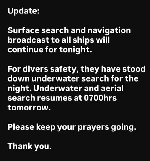 In an Instagram story late on Friday night, the missing man’s sister said the underwater search had been suspended for the night, for the safety of the divers.