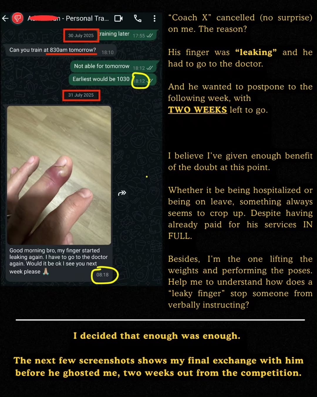 On the day they were scheduled to meet, Coach X allegedly cancelled at the last minute, citing a finger injury.