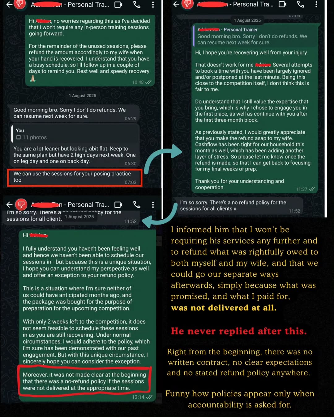 Dray, a personal risk management consultant, shared in an Instagram post on 20 March that the trainer allegedly stopped responding just two weeks before his competition.