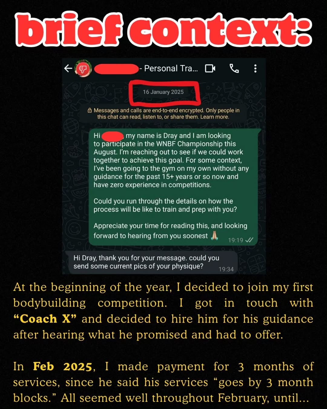 Dray reached out to “Coach X” in Feb 2025 and eventually hired the trainer, paying for three months of services.