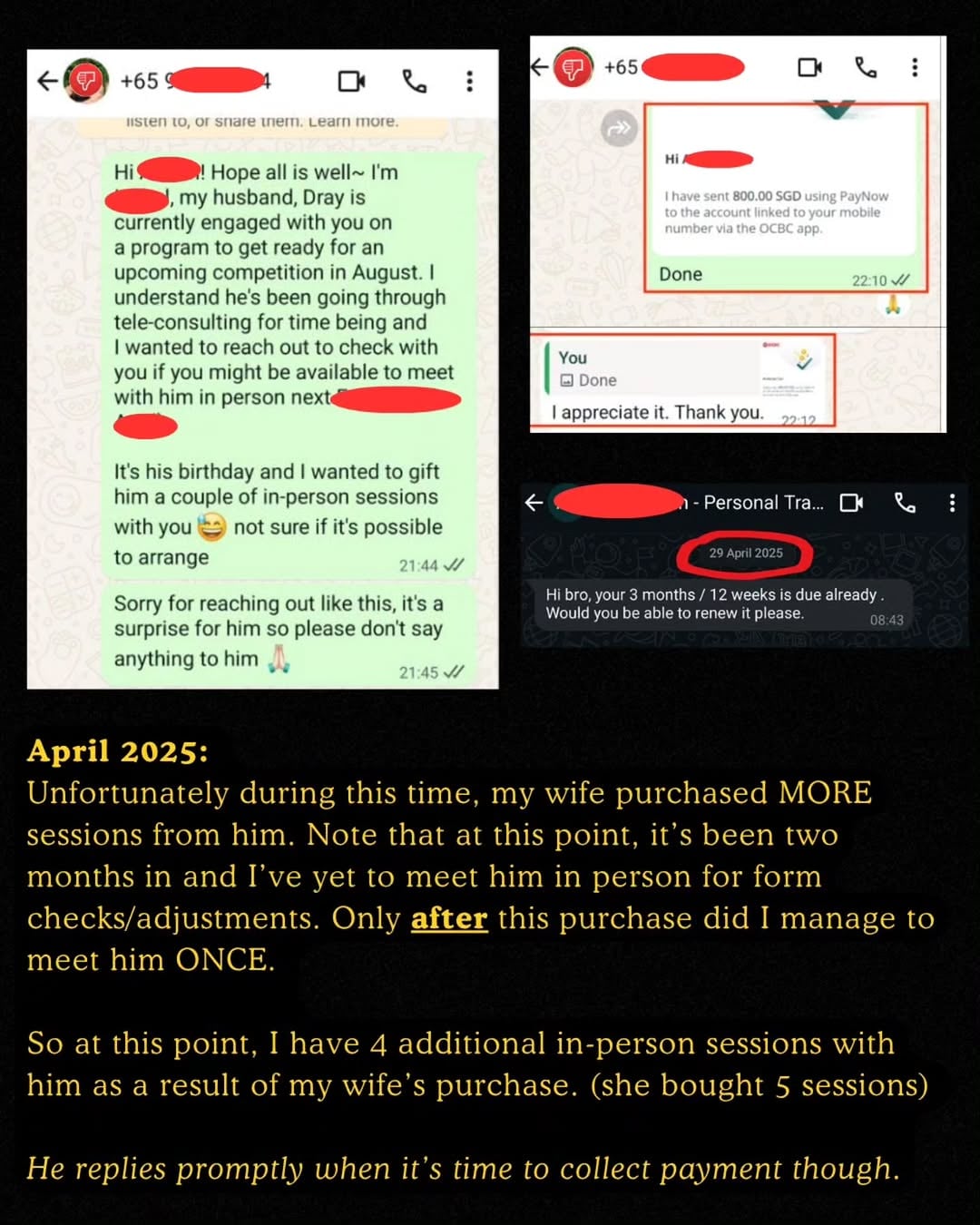 As a surprise, Dray’s wife later contracted Coach X separately to purchase four in-person training sessions for April 2025.