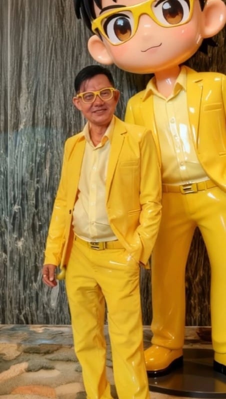 The eye-catching poster featured a man in a bold yellow suit with matching glasses, striking a confident pose.