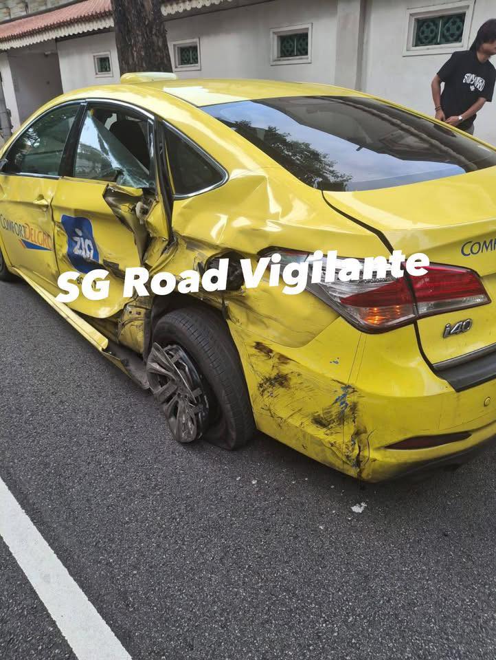 Further up, a yellow ComfortDelGro taxi sustained extensive damage to its left side, with its doors dented and one rear window shattered.