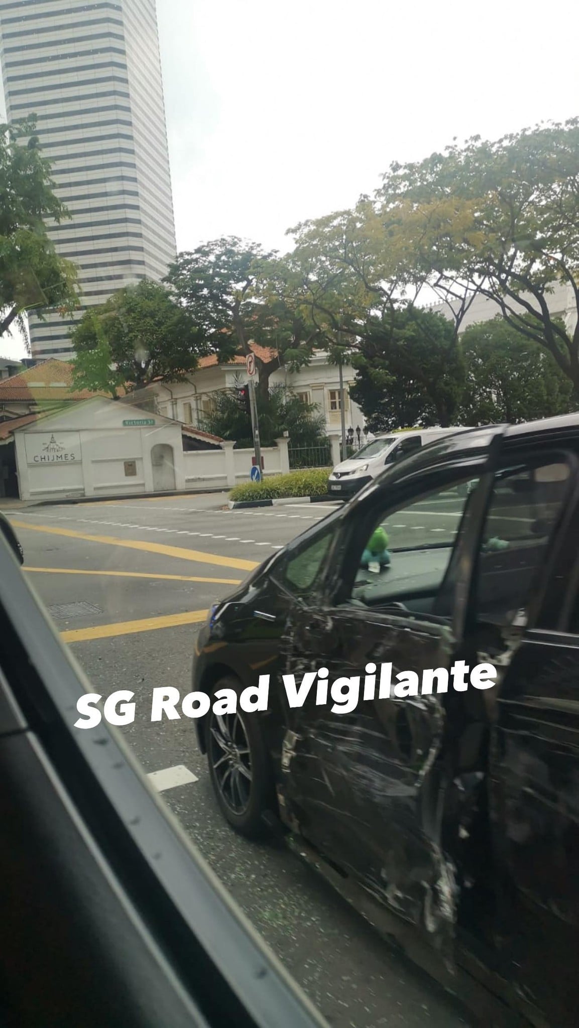 A photo shared on Telegram showed a badly damaged black multi-purpose vehicle on the road outside CHIJMES.