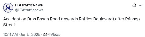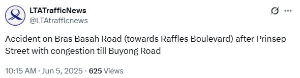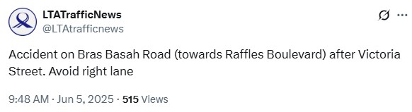 The Land Transport Authority (LTA) first alerted motorists to the accident via X at 9.48am on Thursday (5 June), advising them to avoid the right lane.