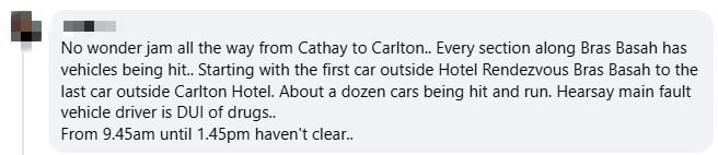 A netizen on Facebook who was at the scene said “every section” along Bras Basah Road, from outside Carlton Hotel to Hotel Rendezous, had vehicles involved in the accident, causing a massive jam.