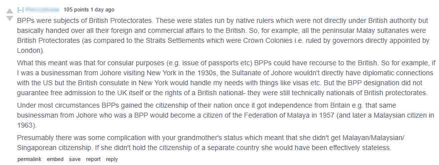 Posting on r/askSingapore on 26 Nov, they asked: “What does it mean to be a British Protected Person in Singapore?”