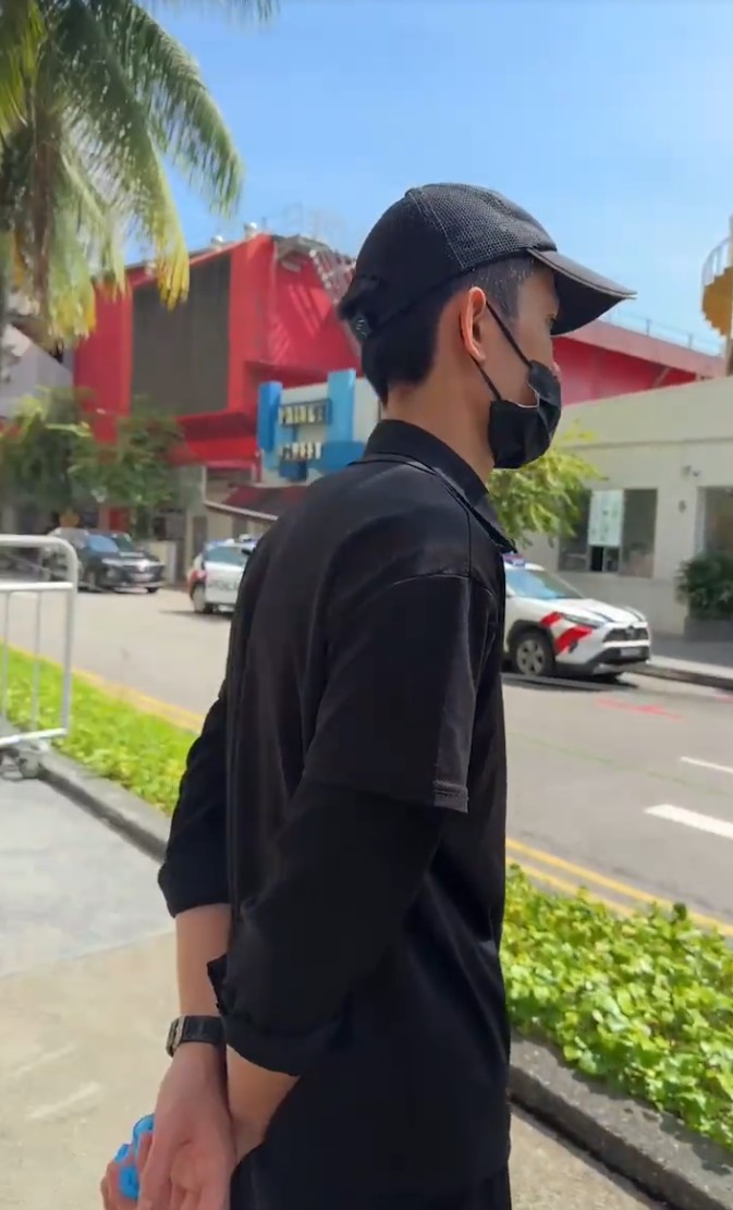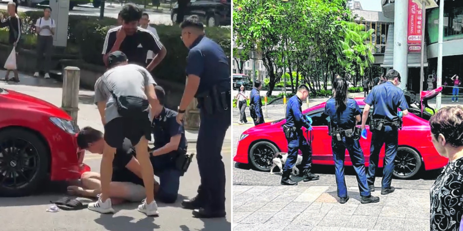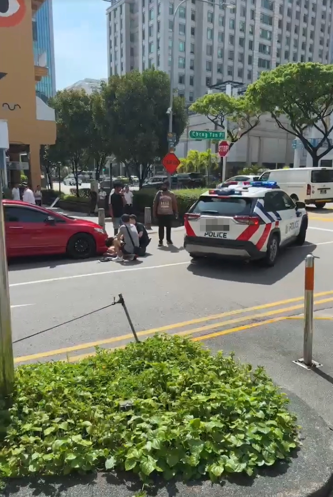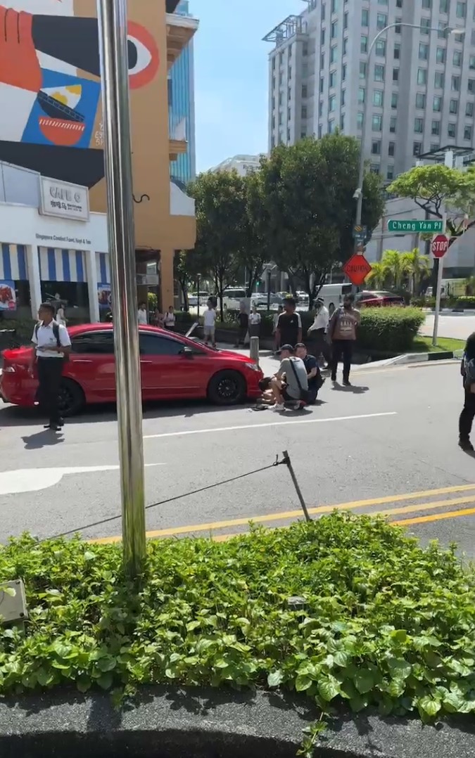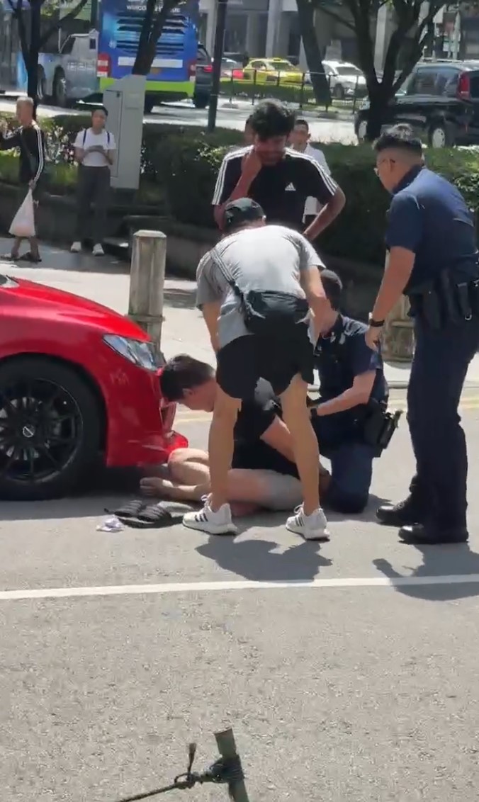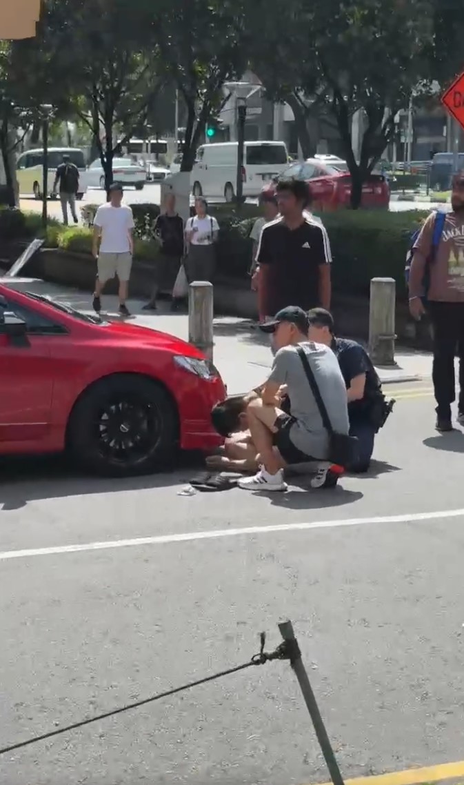 A video on Xiaohongshu showed the driver sitting cross-legged on the road in front of his red car in Bugis.