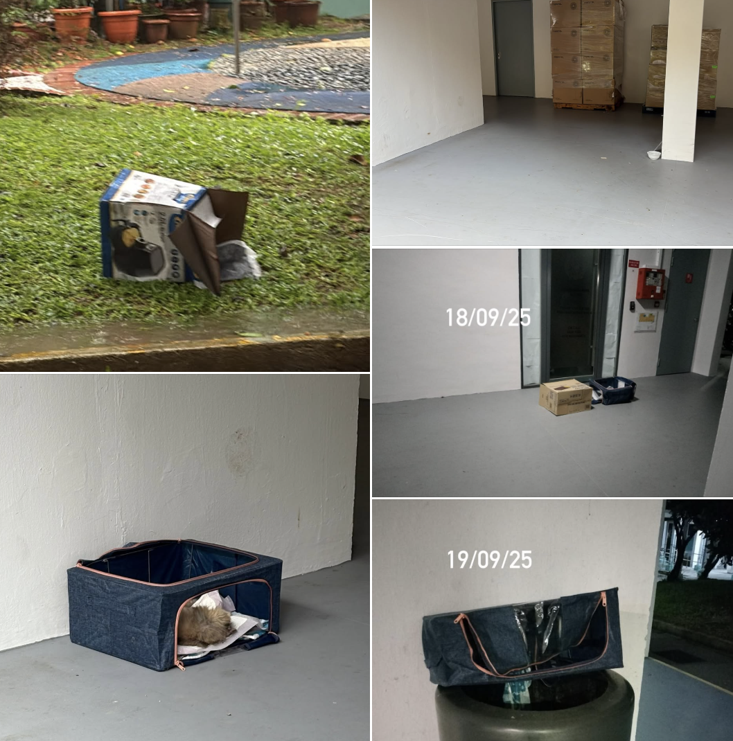 A day later, the boxes were found neatly stacked on a rubbish bin at the void deck — allegedly placed there by the 67-year-old.