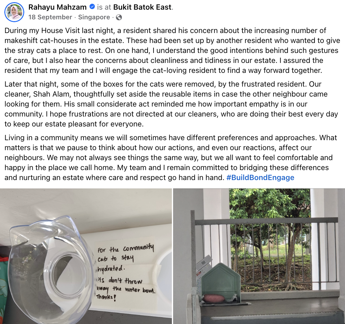 “On one hand, I understand the good intentions behind such gestures of care, but I also hear the concerns about cleanliness and tidiness in our estate,” she wrote in a Facebook post.