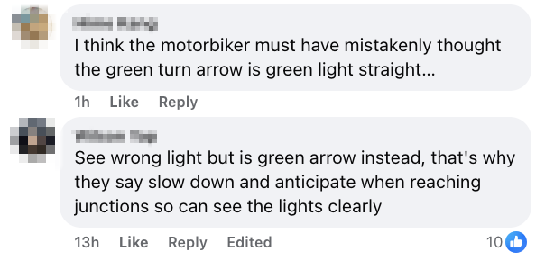 Some netizens speculated that the motorcyclist might have mistaken the green right-turn arrow for a green straight-ahead arrow.