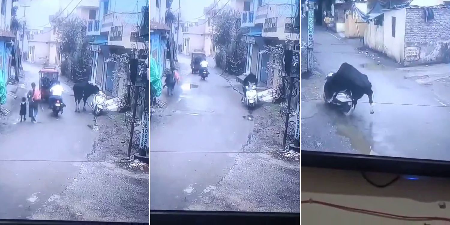 In a moment straight out of a comedy, a stray bull in India decided to borrow a parked scooter, then took it for a wild spin down the street before dramatically crashing it.