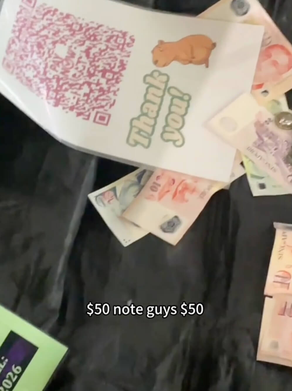 Moments later, a woman approached and unexpectedly dropped a generous S$50 note into their tip bag, leaving them stunned.