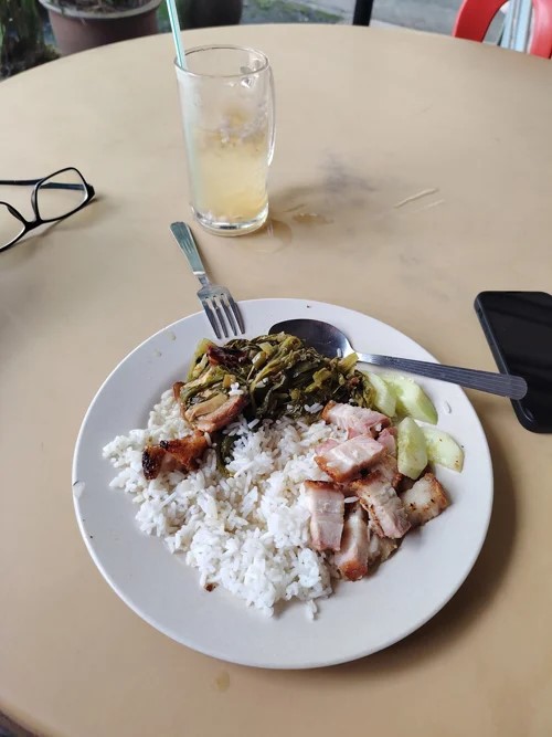 From the photo he shared, he ordered cai png, or economical rice, which consisted of a small portion of vegetables, about seven slices of roast pork, and a few pieces of sliced cucumber.