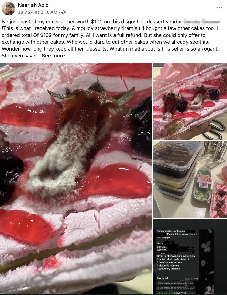 Unsatisfied, Ms Nasriah’s husband called back and requested a full refund, offering to return the desserts via a rider. However, the seller refused, allegedly insisting that she could not refund payments made via CDC vouchers.