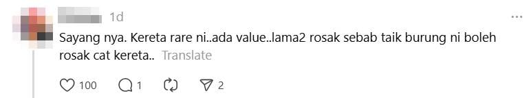 Translation: It’s a shame. This rare car..has value..will likely be damaged over time, as bird droppings can damage the car’s paint..