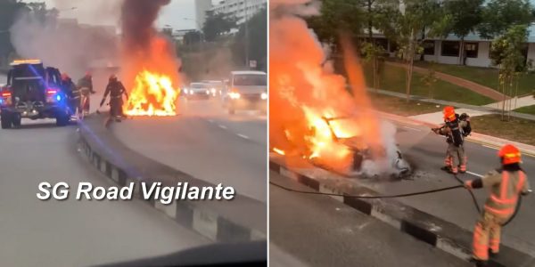 Car destroyed by fire along road in Tampines, SCDF firefighters extinguish it